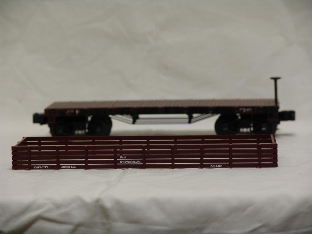 This car comes in the original packaging. The sides of the car were cut loose from the body in order to turn it into a flatcar. This piece is included with the car and could possibly be glued back to the car body to restore it as a gondola. The car body has also roughly been painted black. Sold AS IS.